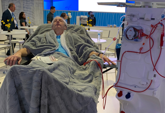 I thought that if I had my eyes closed, people might think I was actually having dialysis, or perhaps if they far enough away, they might not know if I was real. My job was to help the sales people. So, I did not interact with people, made sure no one knew for sure if I was real until they walked up next to me.